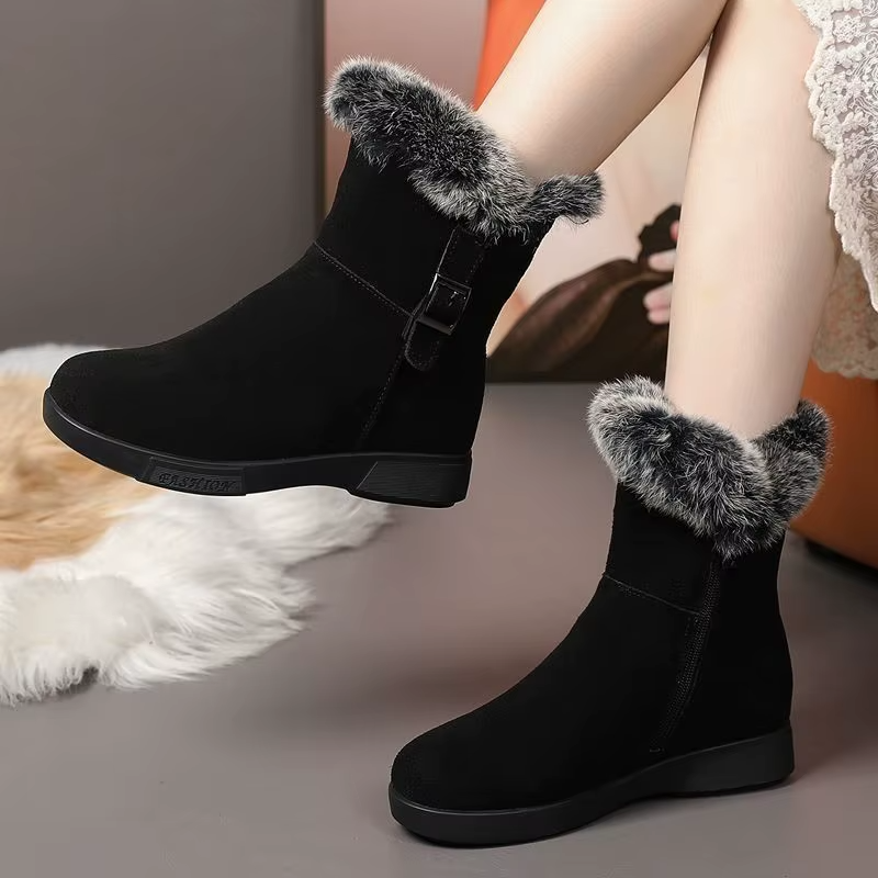 Embrace the magic of winter with boots that wrap your feet in soft, plush warmth. Designed with a charming buckle and easy side zip, they’re your go-to for comfort on frosty days.