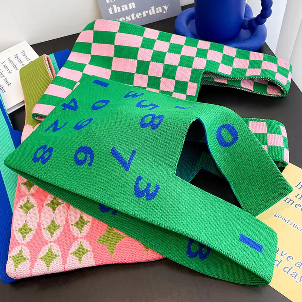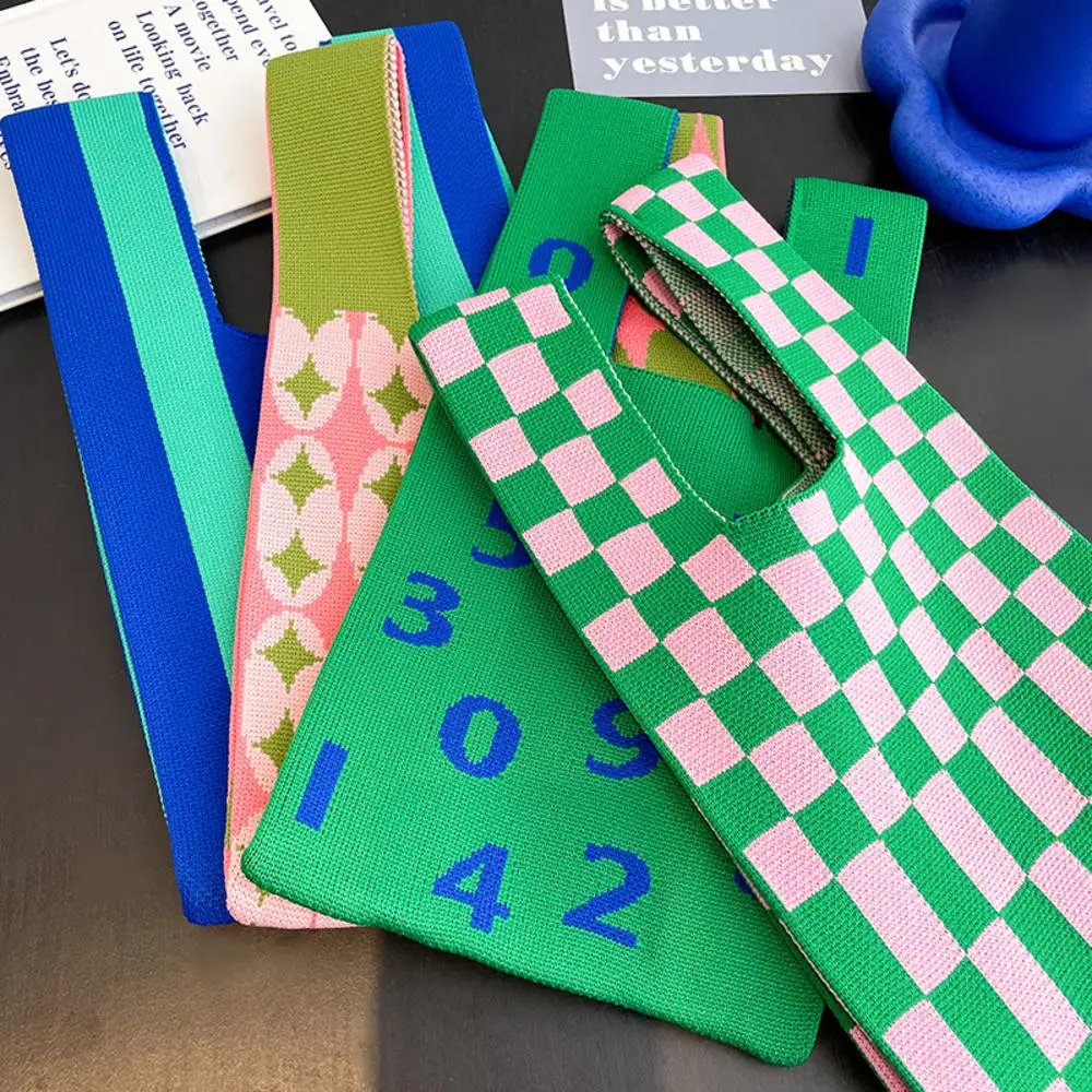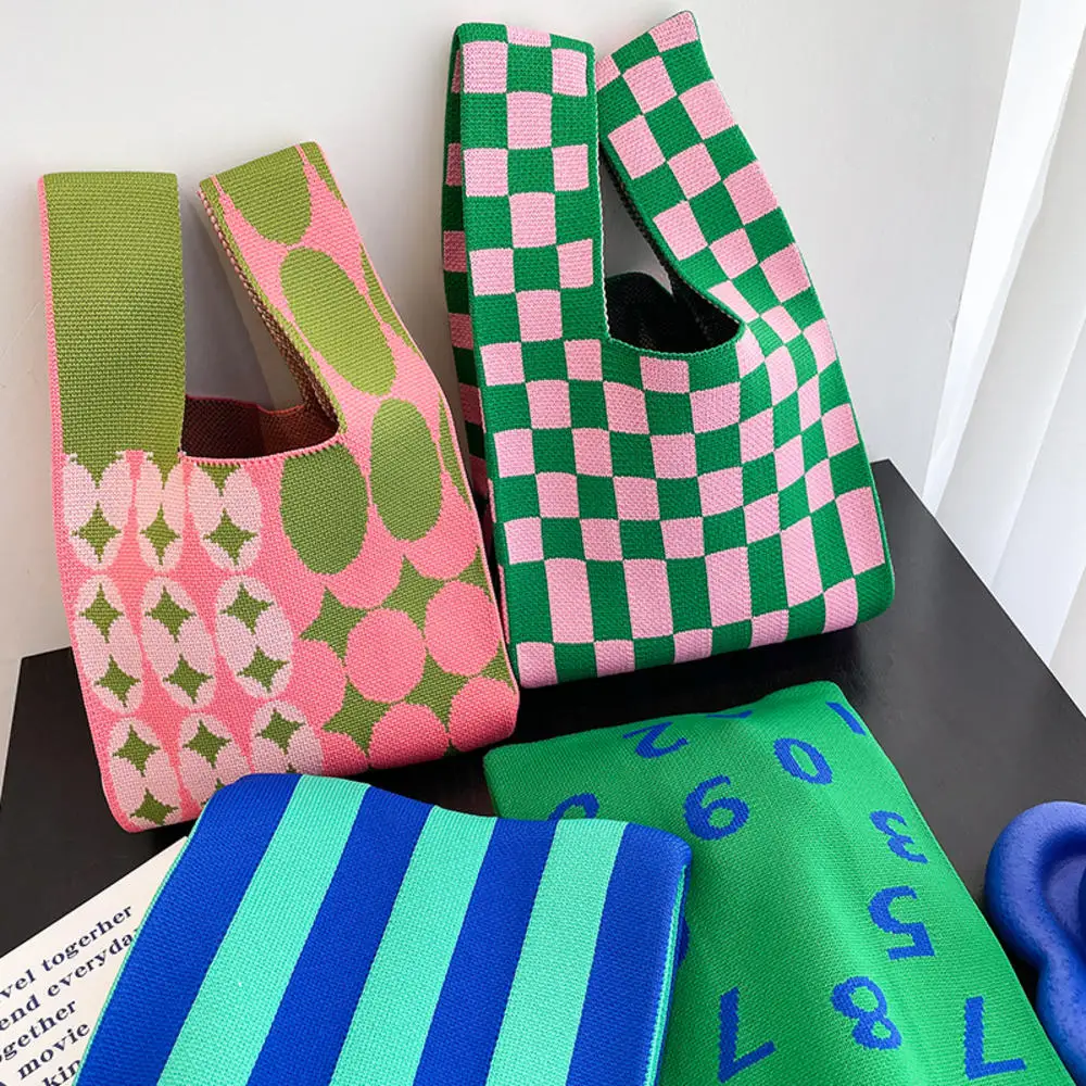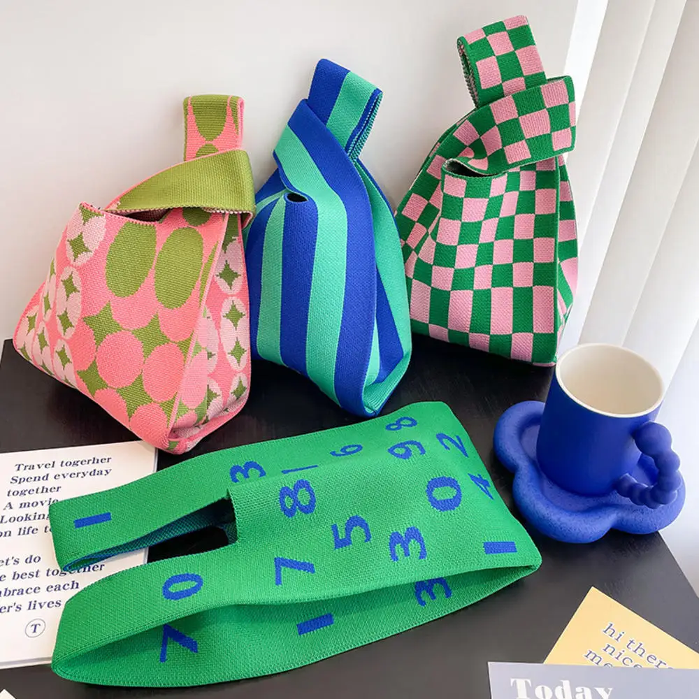 Handmade Knit Handbag Women Mini Knot Wrist Bag Japanese Casual Color Wide Stripe Plaid Tote Bag Student Reusable Shopping Bags