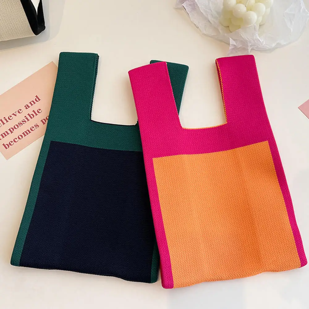 Handmade Knit Handbag Women Mini Knot Wrist Bag Japanese Casual Color Wide Stripe Plaid Tote Bag Student Reusable Shopping Bags