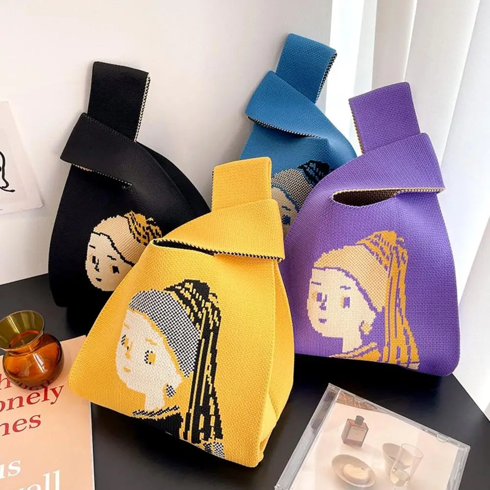 Handmade Knit Handbag Women Mini Knot Wrist Bag Japanese Casual Color Wide Stripe Plaid Tote Bag Student Reusable Shopping Bags