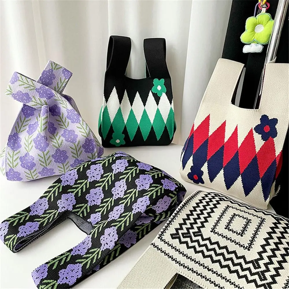 Flower Handmade Knit Handbags Women Knot Wrist Bag Casual Small Tote Bag Girls Reusable Shopping Bags