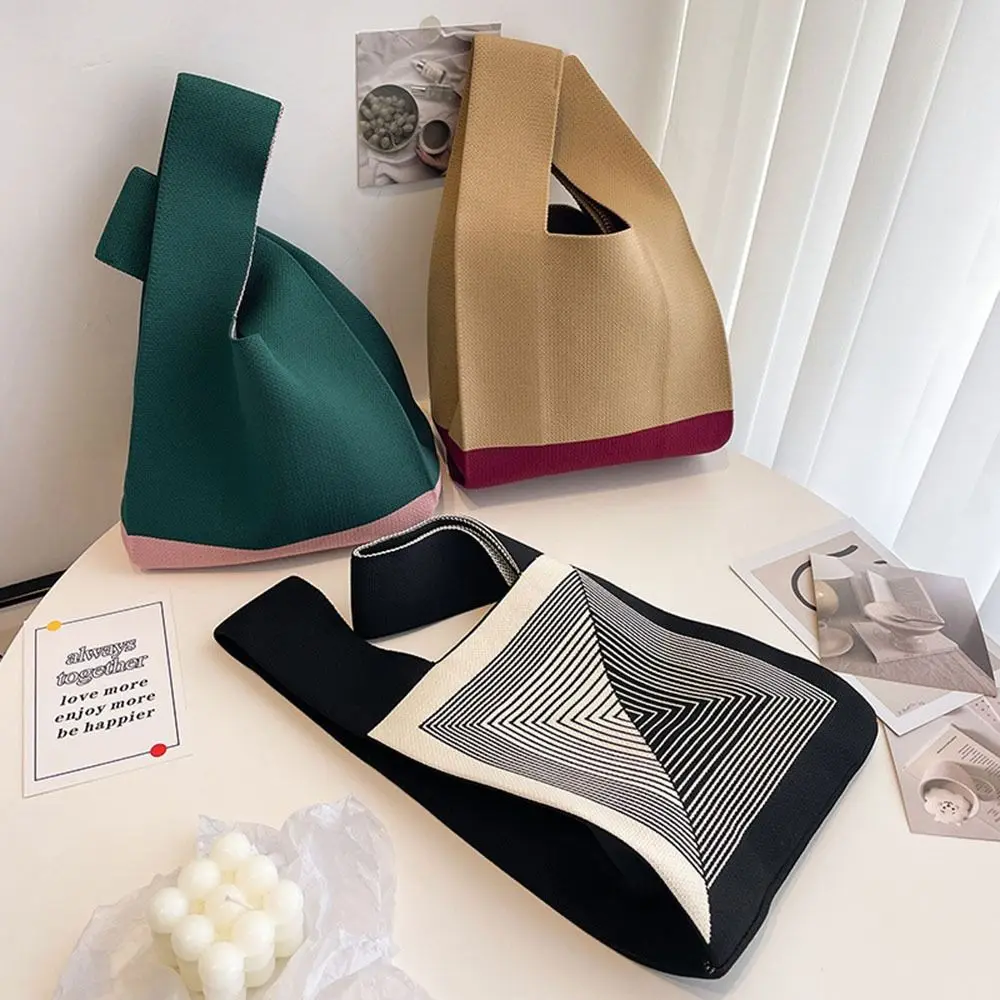 Handmade Knit Handbag Women Mini Knot Wrist Bag Casual Color Plaid Tote Bag Student Reusable Shopping Bags