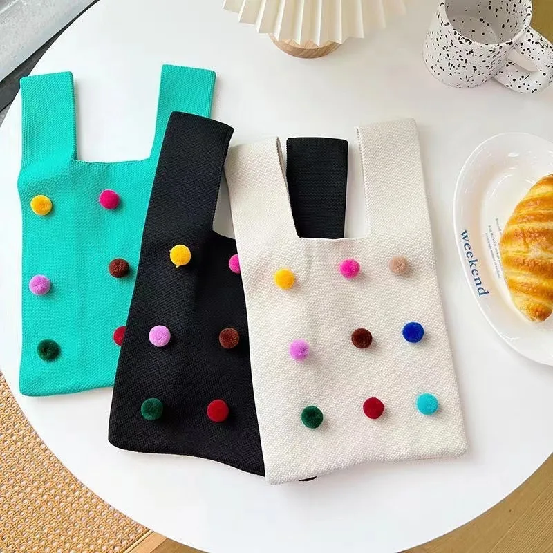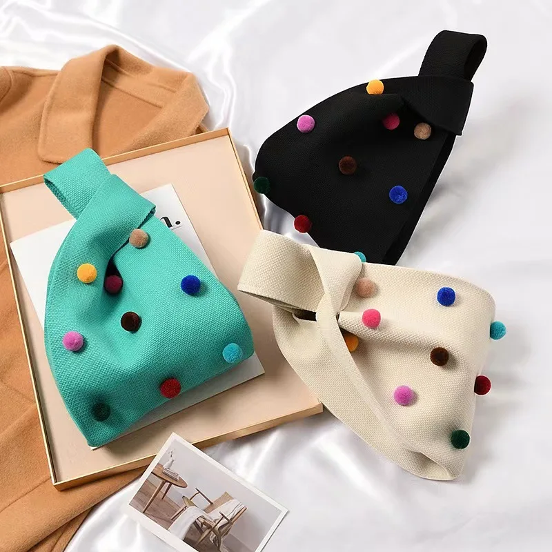 Handmade Knit Handbag Women Mini Knot Wrist Bag Casual Color Wide Stripe Plaid Tote Bag Student Reusable Shopping Bags