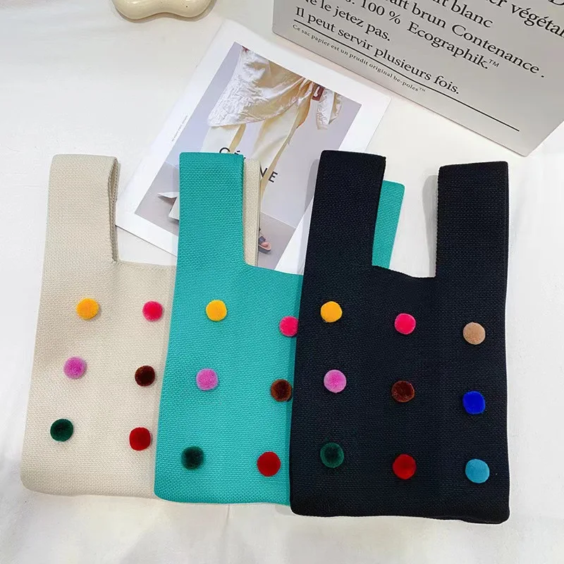 • Handmade Knit Handbag Women Mini Knot Wrist Bag Casual Color Wide Stripe Plaid Tote Bag Student Reusable Shopping Bags