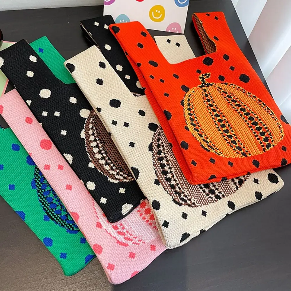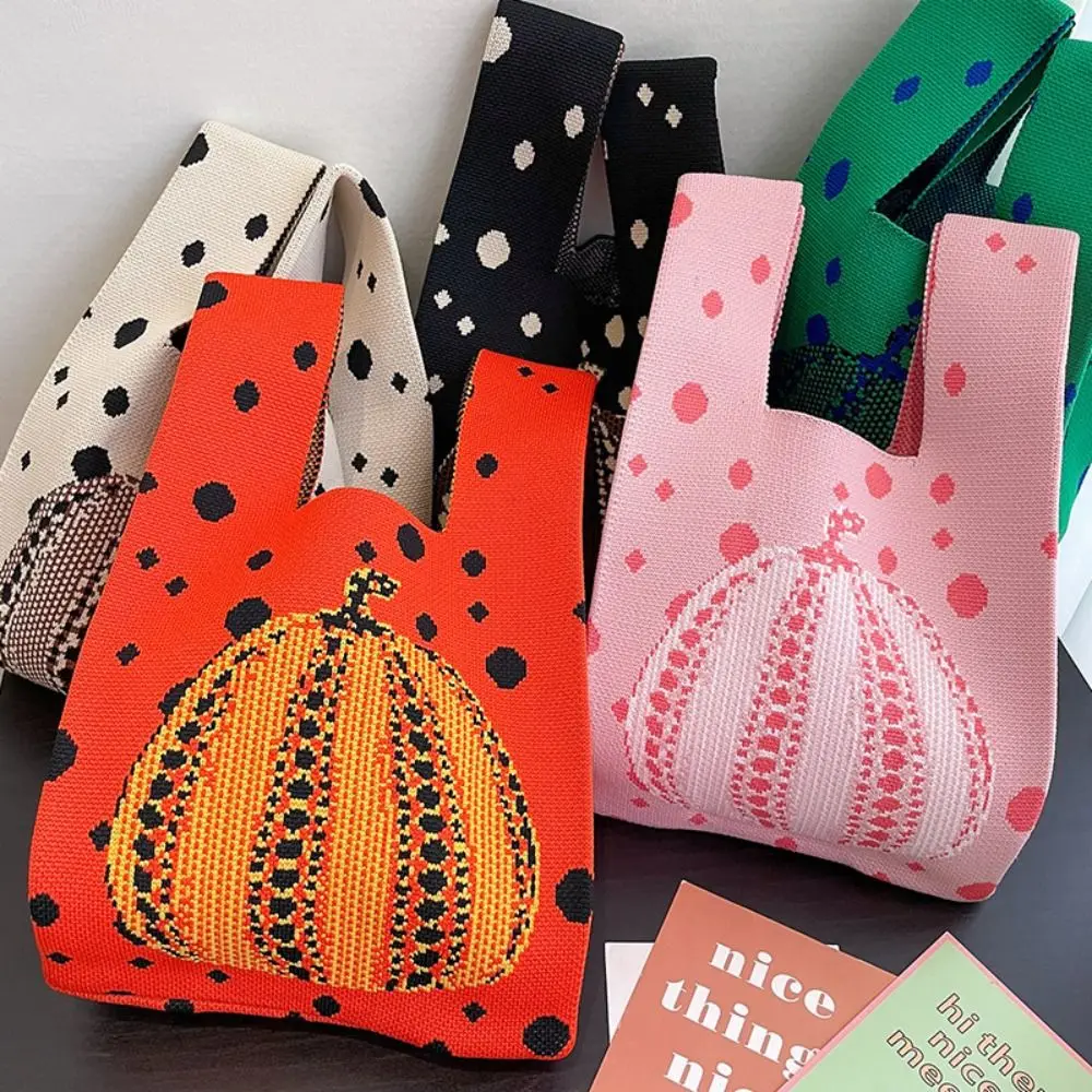 Pumpkin Knit Handbag Reusable Knit High-capacity Tote Bag Knot Wrist Bag Student